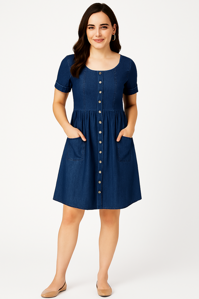 Denim Fit & Flare Dress with Front Buttons & Pockets (Size-M)